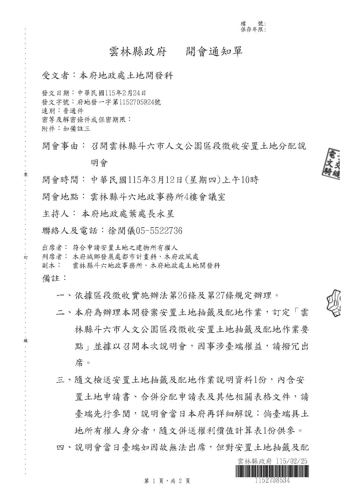 【通知】雲林縣斗六市人文公園區段徵收區段徵收安置土地分配說明會